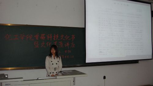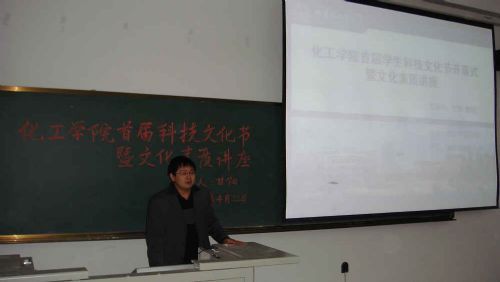 为深入学习实践科学发展观,促进我院科技文化活动的普及和深化,推动校园科技文化建设,增强大学生“创新、创造、创业”意识,激发学生的自主创新能力,丰富学生科技文化生活, 4月22日晚6:30,化工学院首届学生科技文化节开幕式暨文化素质讲座在正心楼106隆重举行,本次学生科技文化节开幕式由院团委主办,0607101班承办。出席会议的领导和嘉宾有化工学院党委副书记岳会敏、工业催化系甘阳教授和院团委负责人刘铭辉以及各年级本科生、硕士生和博士生。开幕式由0607101班的邵志敏同学主持。