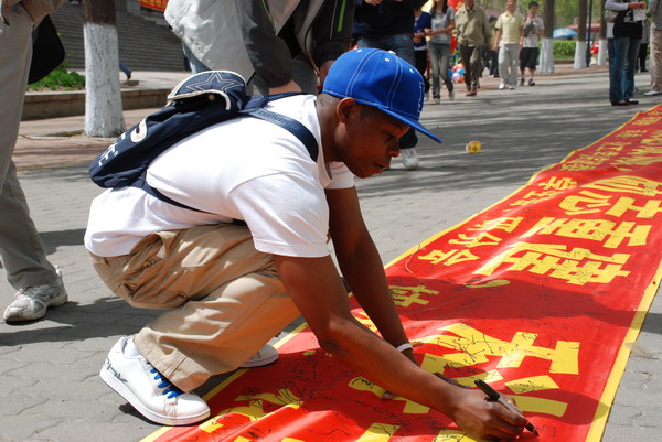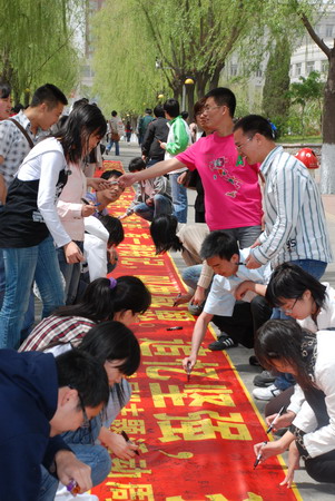 (商艳凯 图)2009年5月12日,是四川汶川特大地震一周年,也是中国的第一个抗震减灾日,太阳成tyc234cc校团委主办,太阳成tyc234cc化工学院团委,学生会,研分会承办,化工学院08级硕士应用化学团支部协办了在一校区步行街上举行的主题为“关注灾区重建,共建和谐发展”的活动。共包含条幅寄语,丝带祝福两项活动,通过此次活动培养学生关注社会奉献爱心的责任意识。 活动现场 师生纷纷签名 留学生送祝福