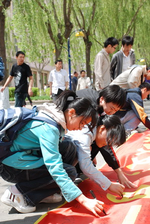 在条幅寄语活动中,从上小学的孩子,到初高中生,到大学生研究生,再到已工作的老师或退休的老人,条幅上的每一寸都写满了他们都对四川死难同胞寄托的无限哀思,对生者送去的美好祝福。活动中还不时的有外国留学生加入其中,表达对于灾区重建和四川人民的信心与祝福。