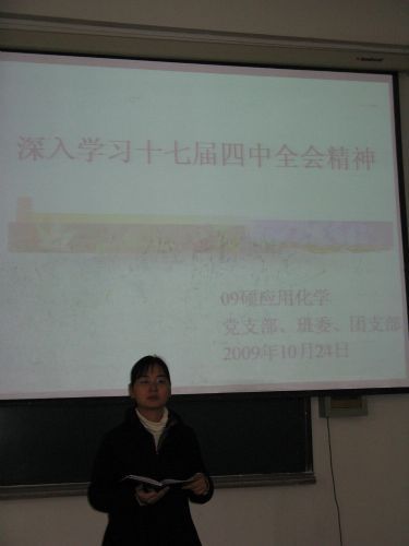 化工学院09级硕士应用化学第一党支部于2009年10月24日在A103举行了以“深入学习十七届四中全会精神”为主题的学习大会,会议由党支部书记张慧主持。会议首先介绍了四中全会的会议议程和主要内容,并组织观看了十七届四中全会会议公报及相关解读视频。