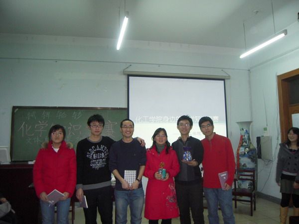 11月29日晚18:30,化工学院研分会举办的研究生学术活动月系列活动之“身边的化学”知识竞赛在L901隆重举行。共有五支队伍参赛,整个活动在和谐又充满竞争的氛围中进行,增长了参赛队员的化学知识,激发了同学们的学习热情。 知识竞赛在一段快乐温馨的音乐中拉开帷幕。整个比赛由“七步对决”、“败者复活”和“三雄争霸”三部分组成,在第一轮中,来自化工学院应用化学专业的张慧同学表现出色,答对全部七道题以第一的身份进入决赛。在随后的“败者复活”赛中,来自应用化学的李炳江挑战成功,也进入决赛。在“三雄争霸”的决赛中,三支队的选手代表展开角逐,最后,张慧同学以绝对优势夺得冠军。现场的亲友团更是激情洋溢,他们在“有奖知识竞答”中积极踊跃,闪耀智慧,台上、台下其乐融融。 最后,活动在一派欢快的气氛中结束,大家在紧张的学习之余体会到了活动的快乐,同时学到了很多就在身边却很少注意的化学知识。