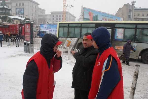 12月5日、6日两天上午,化工学院共有40余名志愿者参与了此项活动。博物馆转盘道临近火车站和多个大型商场,人流量和车流量都相当大,志愿者们顶着凛冽的寒风和满天飞舞的雪花,在路口处时刻注意现场的交通情况,做出正确的判断,引导行人过路,以保证行人的安全,进行交通安全宣传并发放交通安全知识宣传品。