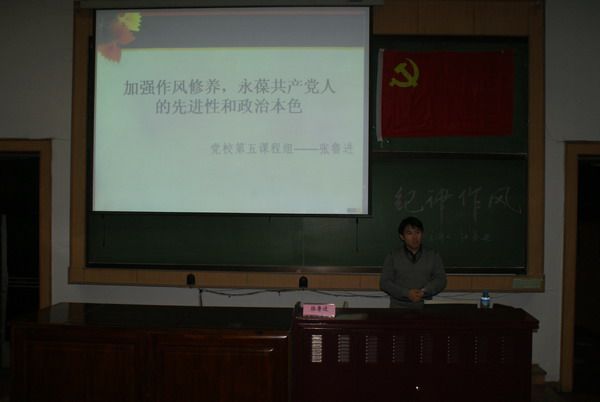 2009年12月12日晚18:30,2009年哈工大党校化工学院——理学院分校预备党员培训班第二讲在L001举行。此次讲座由监察处副处长张鲁进老师主讲,主题是党的纪律作风建设。 讲座过程中,张老师介绍了党的作风建设的基础知识,强调了新形势下加强党的作风建设的重要性、紧迫性及加强学生党员纪律作风的必要性。张老师结合历史,引用实例,详实生动的介绍了党的优良作风,指出了党现阶段面临的的一些问题和挑战,提出学生党员加强作风建设要讲党性、重品行、做表率、培养人格魅力的建议和意见。