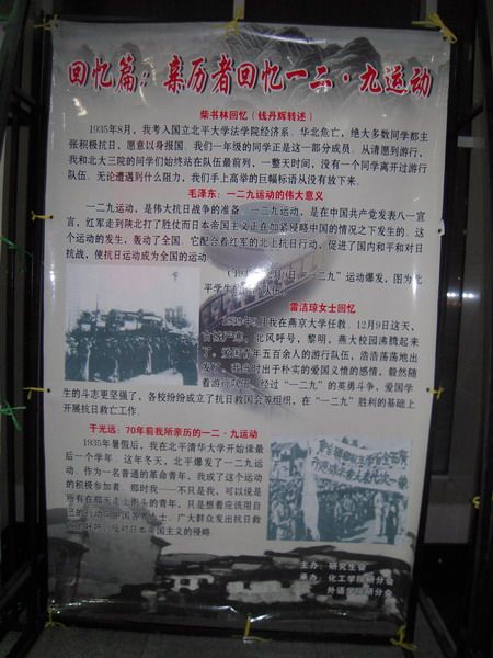 为纪念“12·9”运动七十四周年,弘扬爱国主义精神,激励我校青年的爱国之情、报国之志,由校研究生会主办,化工学院研分会、外国语学院研分会承办的“回眸历史振我中华——纪念‘一二·九运动’图片展”于 12月14日-12月25日在正心楼、诚意楼大厅进行展出。 本次图片展由“简介篇”、“回忆篇”、“宣言片”、“人物篇”及“意义篇”等板块组成,通过图文并茂的彩喷形式全面再现“一二·九”学生爱国运动的历史场景,增强广大师生对此次爱国运动的了解。 通过本次图片展使全校师生融入到“扬先烈爱国志 与祖国共奋进 与工大同发展”的良好氛围中,弘扬当代大学生的民族意识和爱国精神,增强民族的凝聚力和创造力。