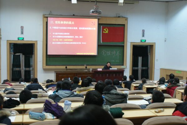 王老师首先简要介绍了党性修养的基本涵义、加强党性修养的目标及内容,然后结合青年党员的自身特点着重讲解了党性修养之重点——政治修养。他以“三个坚持”、“三个不断”总结性地为大家指出了加强政治修养的方法,并深切地希望同学们能够在政治上自觉地锤炼自己,不断提高业务能力和综合素质,努力做党和国家事业的可靠接班人。