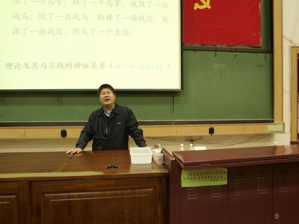 3月29日18:30分,人文与社会科学学院党委副书记高献忠老师来到理学楼L002教室,带领化工学院—理学院党校积极分子培训班全体学员学习了中国特色社会主义理论体系。 “我们要建立学习型党组织,就必须加强党的理论学习和建设。学习党的理论就必须要学习中国特色社会主义理论体系,它是十七大报告中提出的富有创造性的理论。”在讲到理论学习的重要性时,高献忠老师这样说道。讲解过程中,高献忠老师重点对中国特色社会主义理论体系进行了解读。他结合中国近代的历史进程,阐述了这一理论体系的精髓—“解放思想,实事求是”以及二者间的关系。最后,他还列举了改革开放以来我国取得的巨大成就以及在改革开放进程中所出现的问题,并为全体学员播放了胡锦涛总书记在纪念改革开放三十周年时的重要讲话。 通过本次学习,学员们对中国特色社会主义理论有了更加全面、深刻的认识,认识到中国共产党是一个与时俱进的党,是一个开拓创新的党,是一个可以带领中华民族走向伟大复兴的党。全体学员更加坚定了加入这一伟大党组织的信念。
