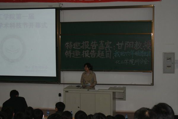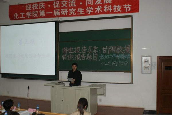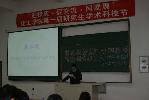2010年4月22日晚18:30,化工学院第一届研究生学术科技节开幕式于正心楼12举行。校团委书记陈苏、研究生工作部副部长魏红梅、化工学院副院长尹鸽平、党委副书记岳会敏、工业催化系主任甘阳以及校研究生会主席团成员、各院系研分会主席应邀出席了开幕式。开幕式由化工学院研究生协理员王玉楠主持。 化工学院党委副书记岳会敏宣布化工学院第一届研究生学术科技节正式开幕,并介绍本次学术科技节的意义及内容。校团委书记陈苏在开幕式上致辞,他指出研究生培养学术创新能力的重要性和必要性,并预祝化工学院第一届研究生学术科技节成功举办,同时表达了对后续精彩节目的期待。化工学院副院长尹鸽平代表学院领导讲话,她说,研究生学术科技节为广大研究生提供了一个广阔的交流平台,希望大家利用这个平台,激发学术钻研热情,培养创新思辨能力,同时谨记“立业先立德,做事先做人”。 开幕式结束后,化工学院工业催化系主任甘阳作了题为“我的六年硕博生涯”特邀报告。甘阳教授求学经历丰富、科研方向几经转换,2007年回国后任教于化工学院。在“我的六年硕博生涯”报告中,他与同学们一起分享的是他于1995-2001年间的硕博学习与研究体会。回顾自己的硕博生涯,甘阳教授站在一个学生的角度,主要介绍了对自己影响深远的人、事、物。总结自己当时的收获,他说,“固有知识固然重要,更重要的是一种学习态度和方法”,并将其概括为以下几个方面:主动、努力、坚持、自信、沟通,希望与同学们共勉之。引用李开复的一句话“Follow Your Heart”,甘阳教授结束了他精彩的报告,并表示欢迎同学们随时与之交流、沟通。 化工学院第一届研究生学术科技节正值哈工大九十华诞来临之际,化工学院研分会谨以此为母校生日献上一份精心准备的学术礼物。