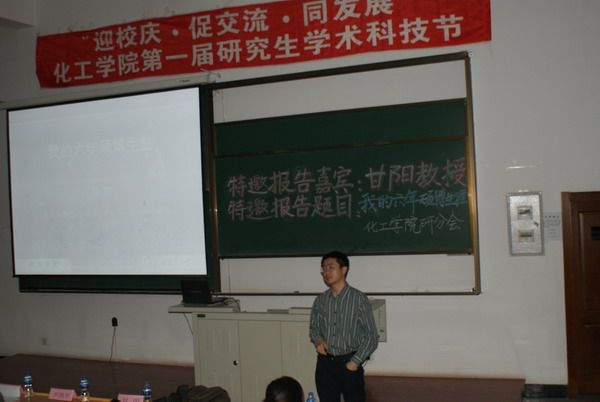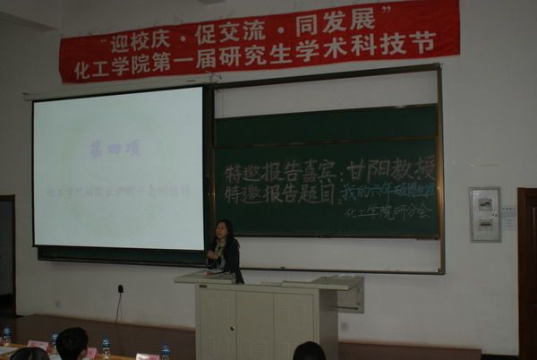 2010年4月22日晚18:30,化工学院第一届研究生学术科技节开幕式于正心楼12举行。校团委书记陈苏、研究生工作部副部长魏红梅、化工学院副院长尹鸽平、党委副书记岳会敏、工业催化系主任甘阳以及校研究生会主席团成员、各院系研分会主席应邀出席了开幕式。开幕式由化工学院研究生协理员王玉楠主持。 化工学院党委副书记岳会敏宣布化工学院第一届研究生学术科技节正式开幕,并介绍本次学术科技节的意义及内容。校团委书记陈苏在开幕式上致辞,他指出研究生培养学术创新能力的重要性和必要性,并预祝化工学院第一届研究生学术科技节成功举办,同时表达了对后续精彩节目的期待。化工学院副院长尹鸽平代表学院领导讲话,她说,研究生学术科技节为广大研究生提供了一个广阔的交流平台,希望大家利用这个平台,激发学术钻研热情,培养创新思辨能力,同时谨记“立业先立德,做事先做人”。 开幕式结束后,化工学院工业催化系主任甘阳作了题为“我的六年硕博生涯”特邀报告。甘阳教授求学经历丰富、科研方向几经转换,2007年回国后任教于化工学院。在“我的六年硕博生涯”报告中,他与同学们一起分享的是他于1995-2001年间的硕博学习与研究体会。回顾自己的硕博生涯,甘阳教授站在一个学生的角度,主要介绍了对自己影响深远的人、事、物。总结自己当时的收获,他说,“固有知识固然重要,更重要的是一种学习态度和方法”,并将其概括为以下几个方面:主动、努力、坚持、自信、沟通,希望与同学们共勉之。引用李开复的一句话“Follow Your Heart”,甘阳教授结束了他精彩的报告,并表示欢迎同学们随时与之交流、沟通。 化工学院第一届研究生学术科技节正值哈工大九十华诞来临之际,化工学院研分会谨以此为母校生日献上一份精心准备的学术礼物。