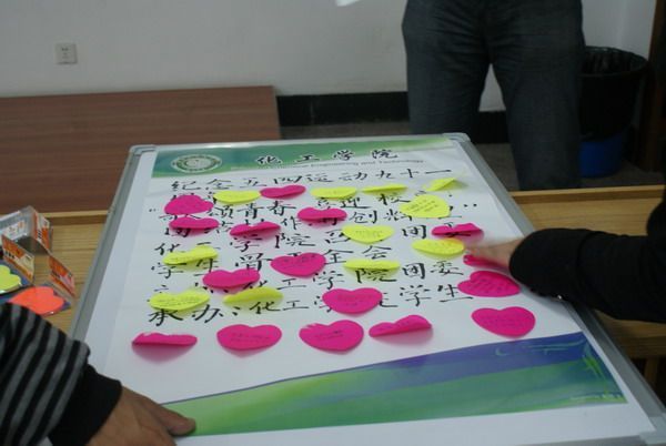 在纪念“五·四”运动九十一周年、母校迎来九十华诞之际,化工学院团委于5月4日晚在正心117召开了“纪念五·四运动九十一周年——‘歌颂青春,喜迎校庆;团结协作,再创辉煌’”主题团会。化工学院团委书记 会议在嘹亮的中国共青团团歌中拉开帷幕。 会后,每位同学都将自己对母校九十华诞的深深祝福写于小卡片上,亲手粘贴到海报上。 后记: 一九一九至二零一零,九十一年历史,传承五四精神,意气风发,奋勇向前; 一九二零至二零一零,九十风雨积累,铭记规格严格,功夫到家,再创辉煌。