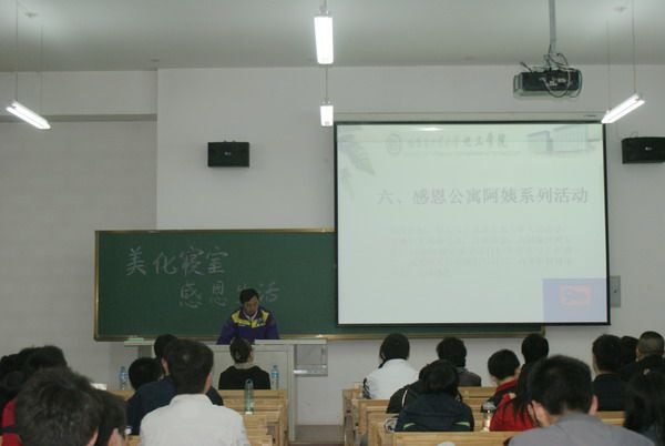 5月11日晚18:30,化工学院首届寝室文化艺术节在正心楼109教室正式开幕。公寓管理中心主任孙静老师,A07、A08、A15、A16公寓楼长,化工学院党委副书记岳会敏老师以及化工学院全体寝室长和部分寝室成员出席开幕式。 本次寝室文化艺术节的主题是“美化寝室,感恩生活”,开幕式在豪迈的哈工大校歌中拉开帷幕。 化工学院寝室管理委员会负责人刘义波代表化工学院同学对公寓工作人员辛勤付出表达由衷的感谢,并介绍了本次寝室文化艺术节的主要内容。 化工学院党委副书记岳会敏老师在开幕式上致辞,他强调,寝室是同学共同的家,良好的寝室卫生环境是同学们高效学习、健康生活的保证。同时,形成和谐包容、积极向上的寝风有助于增进同学友谊、形成寝室同学团结进步的氛围。同时,同学们要学会感恩公寓每一位为大家服务的阿姨,珍惜今天安全、整洁、卫生的寝室生活环境。 公寓管理中心孙静主任对化工学院首届寝室文化艺术开幕表示热烈的祝贺。孙老师指出:养成良好的卫生习惯,搭建和谐的人际关系,会让我们每位同学受益终生。而自觉的担当起自己在寝室中的责任,多为别人着想,有助于我们做好寝室工作,从而更高效的学习和成长。 最后,化工学院优秀寝室风采展示将开幕式推向高潮。党员示范寝室、志愿之星寝室、学习示范寝室、和谐之星寝室依次进行展示。每个寝室各有千秋,寝室代表用时而温馨,时而风趣的语言向大家讲述本寝室的故事与特色,得到了与会人员的高度认可,会场接连响起阵阵掌声。 本次寝室文化艺术节开幕式在热烈的气氛中结束,同学们纷纷表示将积极参与本届寝室文化节,因为他们相信“公寓有我更精彩”。