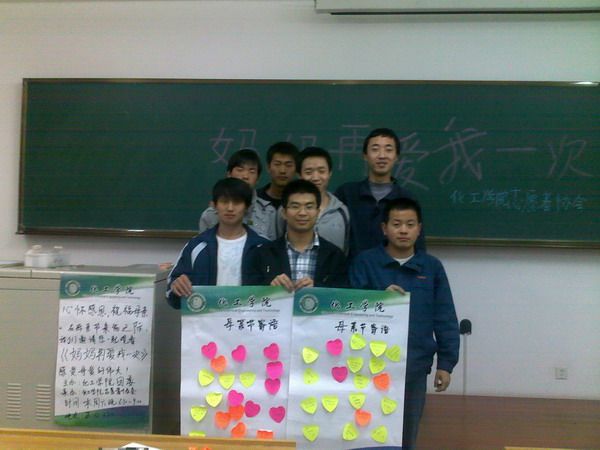 在母亲节来临之际,为加强同学们的思想道德教育,弘扬中华民族珍视亲情,孝敬父母的传统美德,化工学院志愿者协会于2010年5月8日在正心楼222举办了母亲节电影展。 本次活动播放了以母爱为主题的经典电影《妈妈再爱我一次》。剧情描述的是一对母子相依为命,但又因种种原因男主角被迫和母亲分离,在接下来的日子里,男主角和他的母亲经历种种困难,最终与母亲团聚的感人故事。在观看电影的过程中,同学们深深地被剧情感染,泪水润湿了同学们的眼眶,同学们含着泪水看完了整部电影。在活动最后,同学们在心形的卡片上写下了对母亲最真挚的祝福。