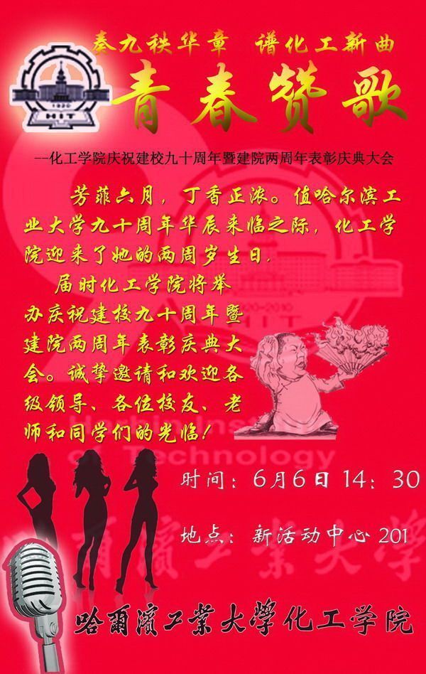 芳菲六月,丁香正浓。值太阳成tyc234cc九十周年华辰来临之际,化工学院迎来了她的两周岁生日。为弘扬哈工大精神,凸显九秩办学特色,烘托校园喜庆气氛,同时展示化工学院成长历程,勾画其美好未来,全院上下群策群力、精心准备,定于2010年6月6日举办化工学院庆祝建校九十周年暨建院两周年表彰庆典大会,用心讲述化工人在哈工大的故事。我们诚挚地邀请和欢迎各级领导、各位校友、老师和同学们届时齐聚一堂,畅叙桃李情谊,同享庆典之乐,共商发展之略。 庆典主题:青春赞歌——奏九秩华章 谱化工新曲 庆典时间: 庆典地点:新活动中心201室 特此公告,敬请各位领导、老师莅临指导! 化工学院