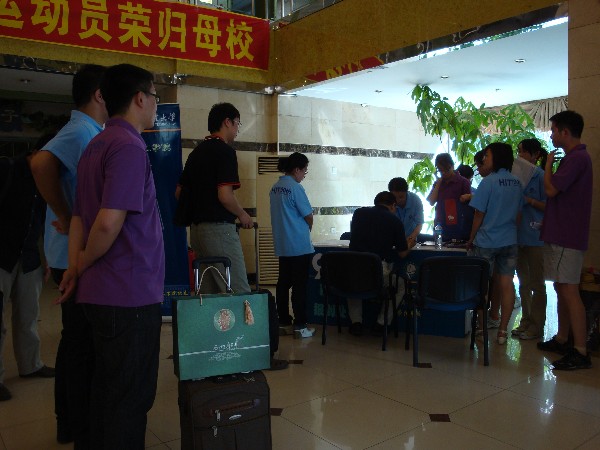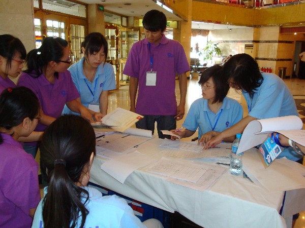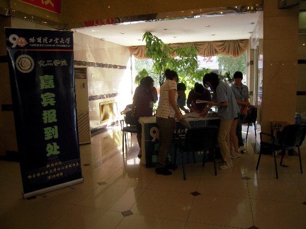 “外面的天气热不热,阳光是不是很灿烂?在校友接待中,我们的志愿者有的只是比气温更高的热情,比阳光更灿烂的笑容!”2010年6月5日是化工学院校友返校的高峰期,校友接待采访组的成员一行五人来到哈特商务酒店,慰问工作在一线的志愿者们,于是就听到了随员组负责人杨玮婧同学的这句话。 记者从报到组组长魏思捷同学那里了解到情况,虽然校友们的返校时间基本集中在6月5日当天,但仍有不少校友提前到达或临时改变行程,致使志愿者不得不提前上岗,所幸诸事已准备妥帖,因此未出现慌乱或措手不及的现象。 看到哈特商务酒店内一片忙碌但又不失条理的景象,校友接待总负责人陈佰爽同学告诉记者:“连续两天的接待工作虽然辛苦,但志愿者们不喊一声苦、不叫一声累,他们热情周到的服务展示了化工人积极、奋进的风貌。” 记者来到志愿者休息室,目睹了这样一幕:几位志愿者再利用短暂的休息时间研究校友所需信息。据了解,他们几人均属校友接待综合组,他们现在从事的并非他们的本职任务。他们说:“大家同是校友接待志愿者,一旦忙起来可能就顾不上原来的任务分工了,经常会有各组人员互相抽调的情况。”问及校友接待工作的感受,他们说:“我们接触到了形形色色的新老校友,直面了最真实的校庆、院庆,愈发地为自己是哈工大人而自豪!”