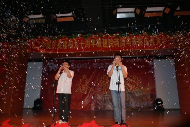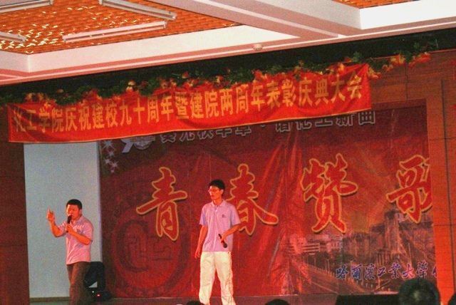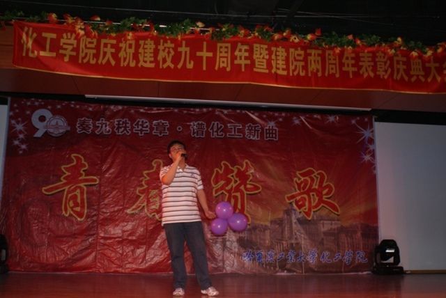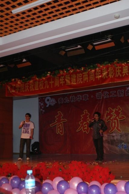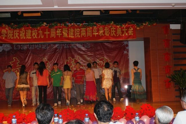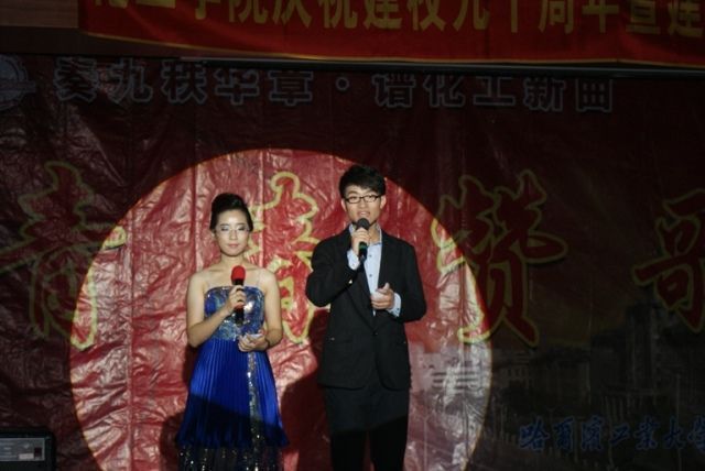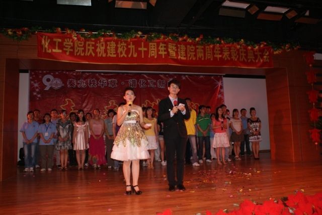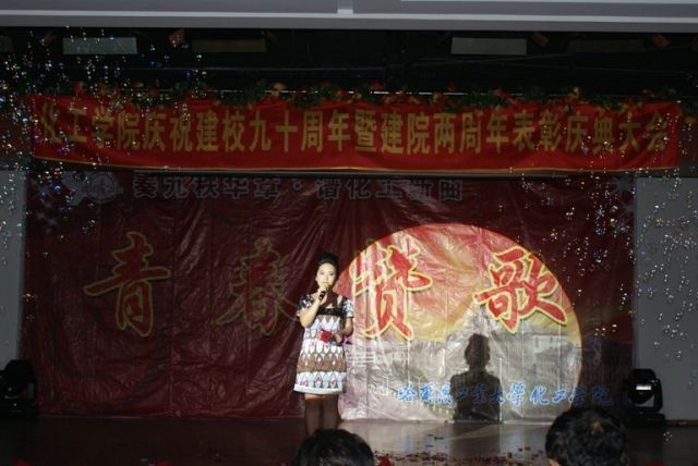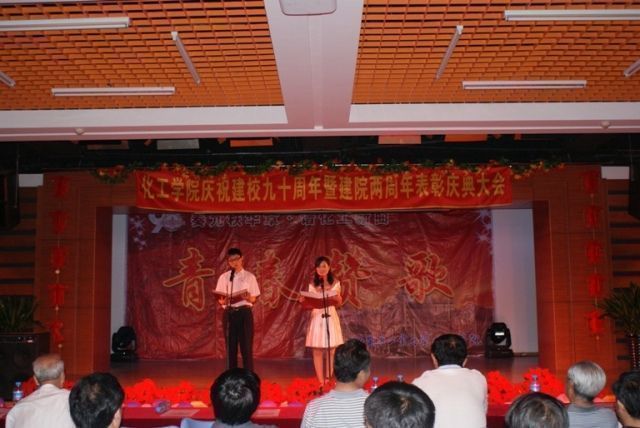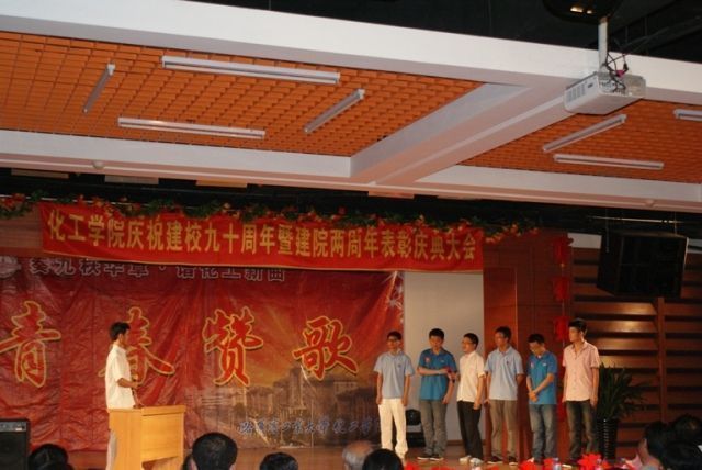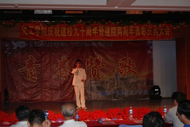 青春赞歌——奏九秩华章,谱化工新曲 ——记化工学院庆祝建校90周年暨建院两周年表彰庆典大会 表彰庆典大会在雄壮、嘹亮的《哈工大之歌》中拉开了帷幕。化工学院党委副书记岳会敏主持第一阶段表彰庆典大会,隆重介绍了参加大会的杰出校友、嘉宾和退休老教师,并宣读有关单位贺信。大会对2009—2010年度学生先进个人、先进集体进行了表彰,学院领导和校友为获奖同学颁发了荣誉证书。 学院党委书记姜兆华介绍了校友的捐款情况,对各位校友给予化工学院发展建设提供的支持和帮助表示了诚挚的谢意。化工学院院长黄玉东代表学院致欢迎辞,他说,化工学院成立时间虽短,但是上世纪三十年代,化工学科就是我校四大主干学科之一,在后来的几十年里,学科的发展几经沉浮,到今天已经走上了蓬勃发展的道路,学科整体实力得到了显著地增强,这其中凝聚着几代化工人的汗水,也凝聚着各位校友和各界人士的支持广泛支持。他代表学院向为学院发展奠定良好基础的各位退休老师、为学院赢来人才培养质量和信誉的海内外杰出校友和长期支持学院发展的社会各界人士、合作单位表示衷心的感谢。黄玉东院长说,这次活动,邀请各位校友为学生先进集体和先进个人颁奖,是希望通过这项活动,激励每一位在校大学生的成长,同时,也是希望以活动为契机,让每一位校友能够真正融入到化工学院的各项工作之中,充分发挥每一位校友的力量与作用,让校友成为化工学院的一份子,共同关心、共同关注化工学院的成长,在大家的共同努力下将化工学院建设成为世界一流的化工学院。 电化学专业校友代表、梧州三和新材料科技有限公司董事长穆俊江和高分子材料与工程专业校友代表、航天科工集团三0六所副所长裴雨辰在会上代表校友讲话。穆俊江校友说,在哈工大学习那段时间是他一生中最美好的时间,学校独到的教学模式 表彰庆典大会第一阶段结束后,学院庆祝建校90周年暨建院两周年文艺演出正式开始。 文艺演出分“朝花夕拾忆峥嵘”“百花齐放赞今朝”“春花秋实育辉煌”三个篇章进行,每一个篇章,都是多才多艺的化工学子们对母校和学院的拳拳感恩和深深祝福。精彩的口琴表演、小提琴独奏、古筝弹奏,高亢的歌喉,旋转的舞姿,幽默诙谐的话剧,别具特色的相声……无一不体现着同学们以母校为豪、以学院为荣的情怀。文艺演出期间,化工学院的杰出校友、各级领导和教职工对同学们的精心准备和精彩表演给予了肯定和赞扬。 化工学院庆祝建校90周年暨建院两周年表彰庆典大会在小合唱《明天会更好》中圆满结束。承载着各级领导的殷切期望、校友们的桃李情怀、教职工们的蜡炬之心、众学子的砥砺奋进,我们相信化工学院定会直挂云帆济沧海! 奏唱哈工大校歌 岳书记主持庆典大会 校友为先进个人颁奖 黄院长为先进班级代表颁奖 黄院长致欢迎词 电化学专业校友代表穆俊江讲话 高分子材料与工程专业校友代表裴雨辰讲话 现场观众 文艺演出开始 大合唱《哈工大校歌+歌唱祖国》 快四:《谁不乖》 口琴合奏:《隐形的翅膀》 话剧:《我的大学》 独唱:《偏偏喜欢你》 戏曲串烧 配乐诗朗诵:《为你写诗》 小提琴独奏:《卡农》 小品:《光棍三人行》 爵士舞:《candy girls》 独唱:《找自己》 CG乐队《不再犹豫》、《爱情节拍》 相声:《我来哈工大》 歌曲:《奔跑》 师生时装表演 歌曲串烧 古筝独奏:《丰收楼鼓》 小合唱:《明天会更好》 尾声 合影
