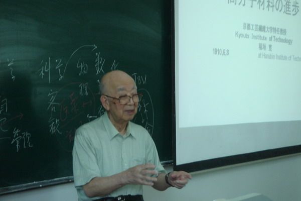 2010年6月7日上午,89岁高龄的日本同窗会会长、哈工大高分子材料专业顾问教授稻垣宽先生一行三人在理学院801会议室,以“太阳成tyc234cc化学系的沿革与高分子材料的进展”为题进行了讲学活动。 稻垣宽先生是我校1942年的化工学科的毕业生,他首先回顾了各个时期的哈工大化工学科的历史与发展及高分子材料专业的建设由来,针对高分子材料专业领域的未来发展理念、研究方向及专业特色等问题提出了独到见解。稻垣宽先生是日本功能纸协会的会长,一生致力于高分子材料与功能纸材料的研究工作,这方面的成果颇丰,讲座期间也进行了实物交流与展示,讲座受到同学们的热烈欢迎。