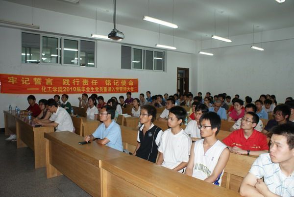 “起来,饥寒交迫的奴隶……”,在高亢的国际歌声中,化工学院2010届毕业生党员于2010年7月1日18:00在正心楼105重温入党誓词,深情感恩母校,庆祝建党89周年。化工学院党委副书记岳会敏、团委书记刘铭辉、研究生协理员王玉楠、党建负责人贺金秋出席了本次会议。化工学院60余位即将毕业的本科生、研究生党员,35位2010年春季学期新党员参加了大会。大会由团委书记刘铭辉主持。 面对着鲜艳的党旗,各位党员一起举起右手,重温誓词。我们党已经走过了89年光辉历程。89年来,一代又一代中国共产党人始终以实现中华民族伟大复兴为己任,继往开来、开拓进取,团结带领全国各族人民战胜各种艰难险阻,在革命、建设、改革的历史进程中不断取得新的胜利。 毕业生党员代表王冬梅在发言中回忆了美好的大学生活,深切表达了对母校 化工学院党委副书记岳会敏代表学院党委讲话。他希望新党员能够积极学习、敢于创新、勇于实践,在生活中切实起到模范带头作用;希望即将走上工作岗位或继续深造的毕业生党员能够始终牢记自己的党员身份,认真做事,善于学习,以实际行动践行“规格严格,功夫到家”的校训,诠释哈工大精神。最后,岳书记为毕业生送上了真挚的祝福,希望他们能够信心百倍地去迎接明天,开创更加美好的未来。