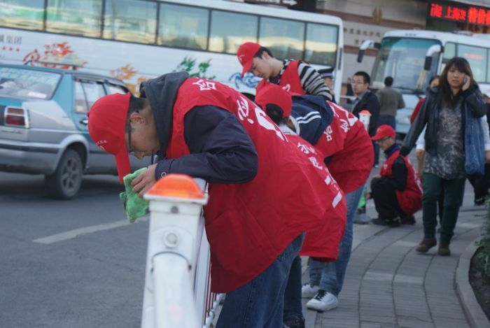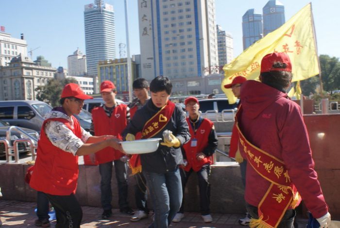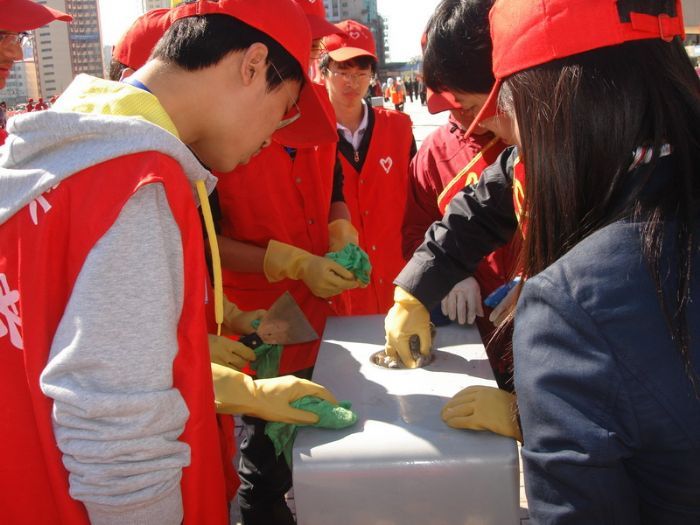 2010年9月29日,化工学院志愿者协会的青年志愿者来到哈站站前广场参与了由南岗区委牵头,市志愿者协会组织的 “绿色十一,欢度国庆”志愿服务活动。 清晨八时许,化工学院志愿者协会的二十位同学身着红色志愿者衫,带着水盆,抹布等清污工具,来到哈站站前广场。国庆前夕的哈尔滨火车站广场的栏杆上,竖起了一面面五星红旗,呈现出一派节日气氛。 上午九时整,化工学院志愿者协会志愿者与南岗区志愿者协会成员及南岗区委机关的干部职工共同开始活动。本次活动负责人为参与人员划分了责任区,明确了任务,随即指导大家对站前广场的公共设施进行清污。志愿者们分小组对所划分区域内的道路栏杆,垃圾箱,塑像等设施实施清污。火车站附近公共设施表面大都污染严重,清理难度较大。同学们发扬“奉献、友爱、互助、进步”的青年志愿者精神,秉承工大人“规格严格,功夫到家”的优良传统,一丝不苟地清除各类污物,一遍遍地擦拭,一次次地冲洗,不肯放过任何一个细节。同学们在完成自己任务的同时,还积极协助,配合其他参与活动的志愿服务人员,体现了工大学子应有的素质和关注社会、服务社会、奉献社会的责任心和爱心。 活动结束以后,南岗区区委的领导同志与同学们做了交流,她勉励同学们继续发扬青年志愿者精神,努力培养社会责任感,并带动身边更多的人投身志愿服务活动。同学们表示,希望能够在南岗区委的支持下,开展更多的志愿活动,让同学们都能参与到志愿服务活动中来,用自己的力量为“同建绿色温馨家园,共享清澈碧水蓝天”做出贡献。