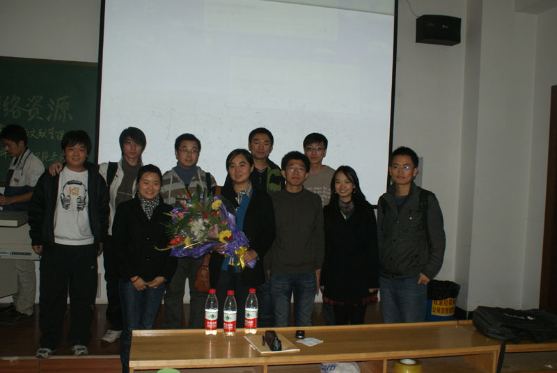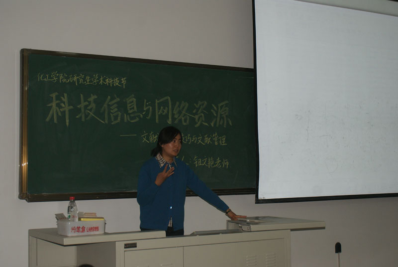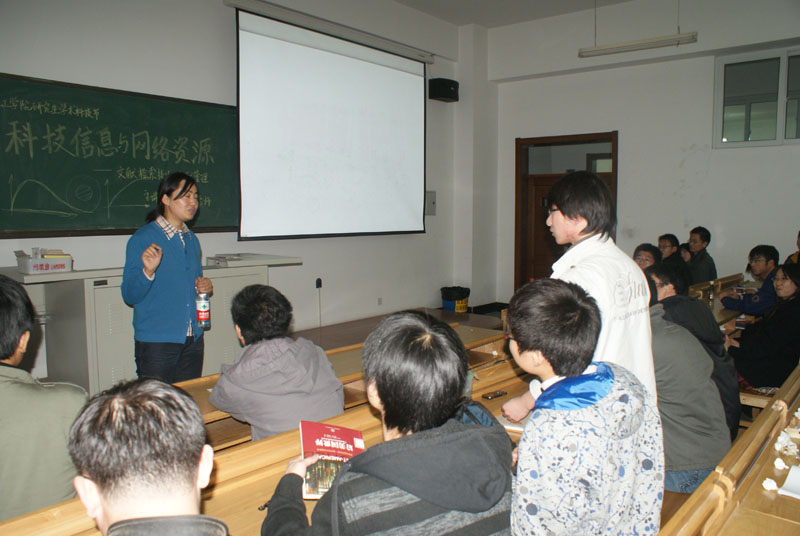 本次活动起到了加强同学们科技文献检索的能力,相信参加了本次培训活动的同学在文献检索知识方面一定有所收获。 钮老师做精彩讲座 同学们认真听讲座 同学现场提问 工作人员与老师合影