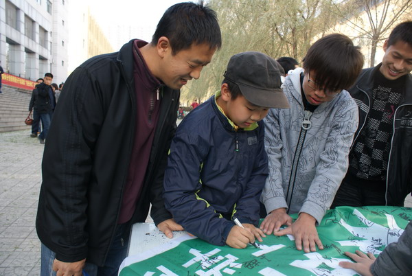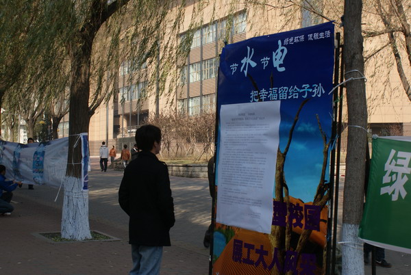 2010年10月31日中午,化工学院团委、青年志愿者协会在学苑楼前举行了“绿色环保,低碳生活”——“ 建设节约型校园,展现工大人风采”主题活动。活动吸引了许多工大师生和部分校外人士参加。 当日中午,化工学院志愿者协会成员在学苑楼前布置了宣传海报,横幅和展板,并在现场进行环保宣讲,通过征集签名,发放调查问卷等形式向师生宣传节约环保知识,倡议全体师生共同践行环保节约理念。 活动现场气氛异常火爆,在“同心同德践行节约资源,群策群力构筑和谐校园”的横幅上,诸多老师、学生签上了自己的名字,许多前来学苑楼就餐的中小学生也参与到了活动当中,所有活动的参与者都表现出了极高的热情。部分同学、老师在横幅上签名后,还仔细向活动组织人员了解了活动的相关情况,并认真填写了调查问卷。 有位低年级的小朋友在听完同学们对环保节约知识的介绍后,非常激动,她以自己独有的方式表达了自己对于争做“环保小卫士”的决心:在横幅上画上了一个大大的笑脸,那张笑脸在横幅巨大背景的衬托下,显得是那么灿烂、阳光。 本次活动中发放的调查问卷包括节水、节电、理性消费等内容,涵盖了校园中的若干浪费现象。活动组织者对调查问卷进行了回收和统计分析。 此次活动是化工学院青年志愿者协会“建设节约型校园,展现工大人风采”系列活动之一,通过系列活动在工大校园内广泛宣扬节约环保理念,减少乃至消除校园里的浪费现象,营造人人争做“环保卫士”的良好氛围,引导每一位同学为构建节约型校园做出贡献!