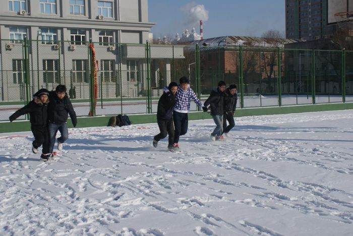 时值严冬,虽已是中午时分,天气依然非常寒冷。十一点三十分左右,参与活动的各个班级准时到场。本场活动分“雪地二人三足”、“雪地角斗士”、“雪雕大赛”,“泼雪联欢”四个项目。