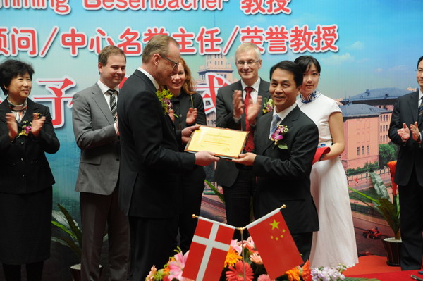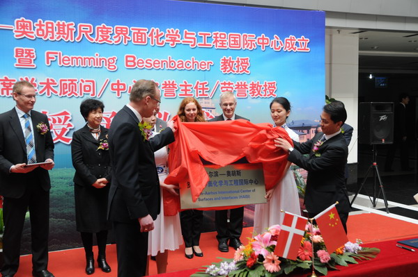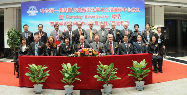 化工学院院长黄玉东、党委书记姜兆华在仪式上分别介绍了“哈尔滨—奥胡斯多尺度界面化学与工程国际中心”成立的背景和意义及弗莱明·贝森巴赫教授的背景和科研成果。副校长任南琪向弗莱明教授颁发了哈工大荣誉教授、首席学术顾问、中心荣誉主任聘书,并与弗莱明教授一起为“哈尔滨—奥胡斯多尺度界面化学与工程国际中心”揭牌。同时,我校还与丹麦奥胡斯大学签署了两校博士生交流合作协议。