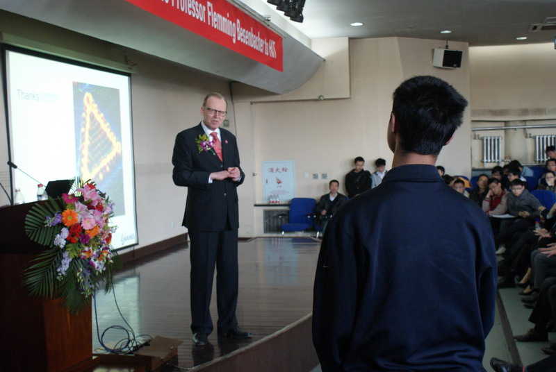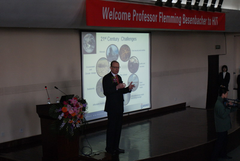 4月5日上午,哈尔滨-奥胡斯多尺度界面化学与工程国际中心荣誉主任、我校首席学术顾问弗莱明·贝森巴赫教授在行政楼113为我校师生作了题为《纳米技术对社会的影响》学术讲座。副校长任南琪教授、丹麦奥胡斯市长尼古拉·魏曼及该市代表团成员、化工学院院长黄玉东、党委书记姜兆华及200余名师生聆听了此次讲座。讲座由副校长任南琪主持。 弗莱明·贝森巴赫教授深入浅出地阐述了什么是纳米科学以及当今纳米科学在世界范围内的应用情况,详细介绍了其实验室在水资源消费、风能利用、DNA技术等诸多涉及能源、医药等领域中成功应用纳米科学的思路和方法。 讲座结束后,在场师生积极提问,会场交流氛围十分浓厚,弗莱明8226;贝森巴赫教授为大家做出了详细而精彩的回答。