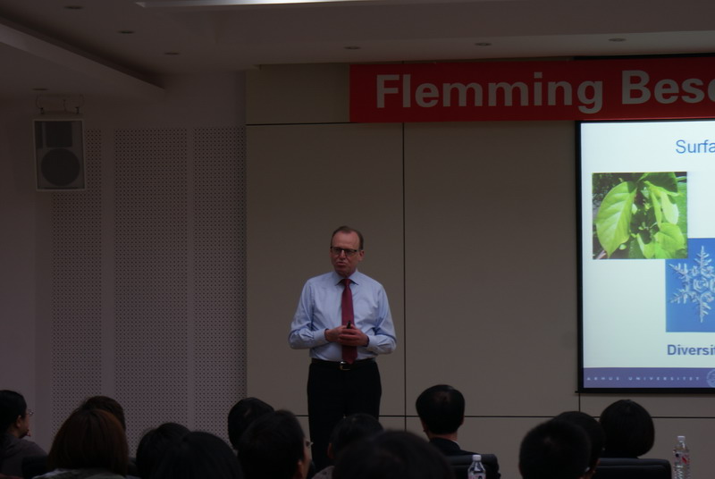 弗莱明·贝森巴赫教授向大家介绍了扫描隧道显微镜(STM)的应用背景,并以催化体系的研究为例详细讲解了STM的使用情况。 1980年以来,弗莱明·贝森巴赫教授在表面与界面科学方面作出了大量原始、创兴以及突破性的工作,其中在工业催化和生物自组装等重要物理和化学过程的原子尺度上的研究成果被公认为该领域发展的里程碑。贝森巴赫教授研究组研创出世界上最好的测试仪器之一“奥胡斯扫描隧道显微镜”,可以在原子尺度上对表面行貌、原子位移和原位反应进行实时动态表征。该产品现已与德国Specs公司联合销售到世界各地,成为超高真空扫描隧道显微镜最佳品牌。