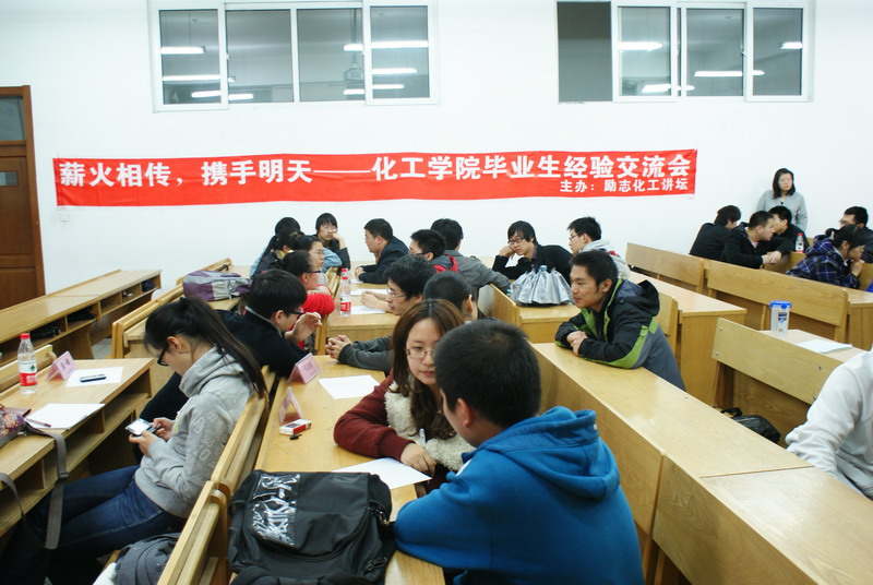 4月17日晚,由励志化工讲坛组织的“薪火相传,携手明天——化工学院毕业生经验交流会”在正心楼116成功举办。本次活动邀请了2011届优秀毕业生与同学们交流保研、考研、出国、就业等方面的经验和心得。 主持人在介绍出席交流会的嘉宾后,活动现场分为四个区域,分别就出国、就业、考研、保研方面的问题进行探讨,针对同学们的问题和疑惑,嘉宾们结合自身的经验,详细解答,并为同学们的学习、生活和未来发展提出合理建议。交流会在热烈的气氛中结束,同学们纷纷表示收获颇丰,并希望有更多的机会与优秀学长交流。 通过本次交流会,同学们对自己的未来都有了较明确的规划,对于成长过程中的疑问和困惑得到了满意的答案;各位嘉宾也纷纷表示,在毕业前能为学弟学妹们答疑解惑,对自己的大学生活很有意义。