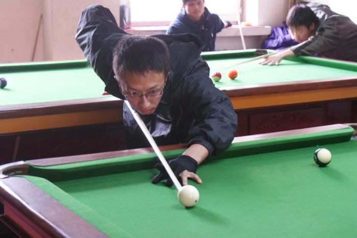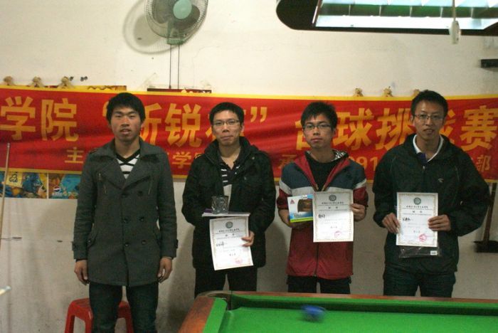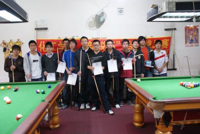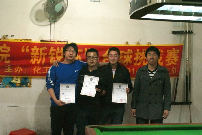 2011年4月30日,化工学院“新锐杯”台球挑战赛在飞旋台球会馆成功举行。本次活动受到了同学们的热烈欢迎,来自不同年级的20多名选手参加了本次比赛,活动取得良好效果。 本次比赛采用杯赛赛制。首先进行小组赛,四人一组,组内循环,小组第一出线,然后进行淘汰赛。比赛期间选手们神情专注,各显神通,有的选手击球神准,令人惊叹,充分体现了“位不好,准来找”的流行风格。而有的选手凭借着出色的走位,自如地掌控着比赛,用过硬的技术与心理素质赢下了一局又一局的比赛。经过近三个小时的激战,冠亚季军顺利出炉,雷龙飞、宋建伟、白国锋分获冠亚季军。本科生辅导员贺金秋为获奖选手颁发了证书及奖品。 本次“新锐杯”台球挑战赛在“五一”假期期间举办,旨在丰富学生课余生活,增强学生对台球运动的了解,增进台球爱好者之间的交流。本次活动的开展为喜爱台球的同学们提供了一个展示自己的平台,为促进和谐校园建设贡献了力量。