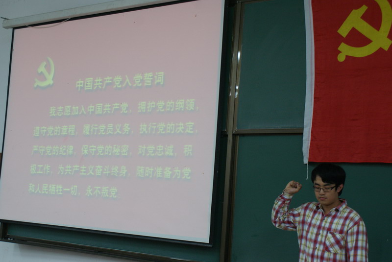 为纪念中国共产党建党90周年,6月28日晚6点半,化工学院在正心11教室举行新党员入党宣誓暨老党员重温誓词大会,化工学院全体学生党员参加会议。 活动在庄严的《国际歌》声中开始。全体党员面向党旗,庄严地举起右手进行宣誓,向党组织立下自己的铮铮誓言。李佳杰同学代表新党员做了发言。他郑重承诺:在今后的学习、工作中,一定牢记誓言,努力学习党的理论知识,以优秀共产党员为榜样,立足现实,把个人抱负与祖国发展需要紧密联系起来,全心全意为人民服务。毕业生党员代表张慧作了发言,她首先对学校、学院老师的谆谆教导和无微关怀表达了衷心的感谢,同时也感谢了支部党员同志对自己的督促和帮助。她表示,走上工作岗位后,将继续以“规格严格,功夫到家”的校训勉励自己,用母校赋予的知识和智慧描绘出壮美的人生画卷! 最后,学院学生党建负责人贺金秋老师作了总结发言。他首先对新党员的加入表示热烈欢迎,同时也向毕业生党员送出了真诚祝福。最后,他向全体党员同志提出要求:进一步端正入党动机,自觉提高党性,始终保持共产党员的先进性,真正践行自己许下的铮铮誓言。