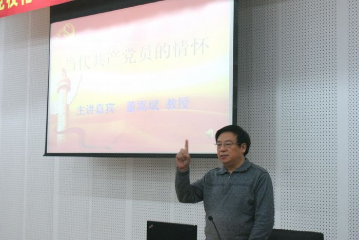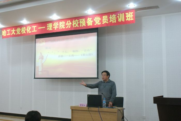 10月20日晚,哈工大党校化工学院-理学院分校预备党员培训班第二讲在活动中心227顺利举行。董嵩斌教授为大家带来了题为“当代共产党员的情怀”的精彩讲座。 董老师从“一个人、一幅图、一首诗”切入主题,辅以“两首歌”和“三感”为大家阐述了自豪感、责任感和使命感对当代大学生的重要意义,教育我们青年共产党员要以饱满的自豪感和庄严的使命感肩负起建设社会主义事业的历史责任。董老师还以生动的实例和具体的数字,教育青年共产党员在成长中应该注重培养的三点:高唱两首歌,在忧患意识下爱党爱国爱民;坚守一个魂,在党性修养中发挥党员的价值和作用;养好精气神,在健康心态下经受风雨考验。共产党人只有树立忧患意识,先天下之忧而忧,才能经受得起新时代的考验,才能拒腐防变,才能在恶劣的外部环境中茁壮成长;只有不断提高党性意识才能从根本上提高自身的素质;只有培养积极向上的心态,人的潜能才能得到最大程度的发挥。最后,董教授殷切激励在场学员要树立远大目标,高扬党性修养的旗帜,不断提升自我,切实发挥党员先锋模范作用。(董嵩斌教授,现担任中国高等教育学会高校党校教育研究分会副会长、东北地区高校党校工作联络领导组组长等职务,多年来为校内外广大师生讲授党课。)