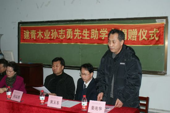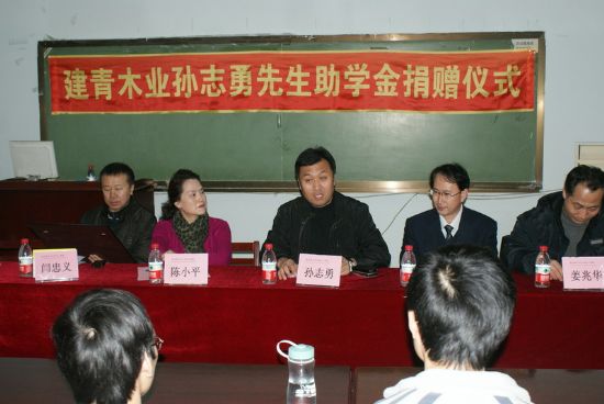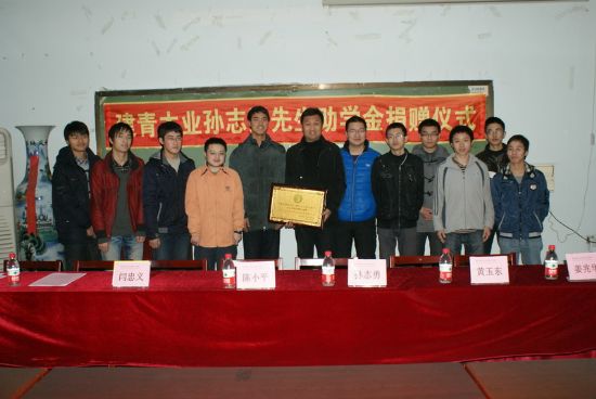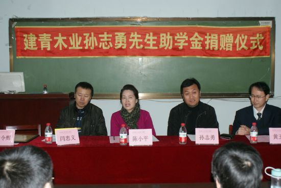 2011年11月30日下午,建青木业助学金捐赠仪式在理学楼901举行。省政协委员、省民建妇女委员会主任、民建省委第四支部主任陈小平、民建省委社会工作服务部部长闫忠义、建青木业公司总经理孙志勇、化工学院院长黄玉东、党委书记姜兆华、党委副书记岳会敏等出席了捐赠仪式。 化工学院党委副书记岳会敏介绍了2010年度建青木业助学金使用情况。姜兆华书记在致辞中对建青木业回馈社会、支持高教事业的善举表示由衷的敬意和感谢,并感谢建青木业对化工学院人才培养的关注与支持,同时希望同学们学会感恩,争取更大的成绩回报母校回馈社会。孙志勇先生对化工学院三年来在建青木业助学金评选、发放等方面的认真细致的工作表示感激,表达了个人对助推学子成才的强烈意愿,鼓励同学们在学业上、工作岗位上能够做得跟好,同时希望同学们将来能有所成就积极地回馈社会。孙小平主任在致辞中代表民建省委对孙志勇的捐资助学表示赞许,并对民建和高校的后续合作提出了良好的建议,同时对同学们寄予很大的期望。 黄玉东院长代表学院向孙志勇先生颁发了捐赠纪念奖牌。 化工学院党委书记姜兆华教授致辞 建青木业总经理孙志勇先生致辞 民建省委第四支部主任陈小平致辞 黄玉东院长向孙志勇先生颁发捐赠纪念奖牌 捐赠仪式现场 受资助学子与孙志勇先生合影 与会人员合影