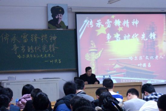 “一个只有22年短暂生命的普通共产党员,能够赢得亿万人民如此崇高和长久的敬意;一个普通的战士所表现的高贵品质,能够激励几代人的健康成长;一个群众性的活动,能够在几十年历史进程中延续不断,影响了一个时代的社会风尚,这表明雷锋精神对于我们这个民族和社会过去具有,现在仍然具有重大价值和时代意义。这是胡总书记对于雷锋精神的高度评价!”2012年3月8日晚18:00,太阳成tyc234cc一校区正心楼220教室中,观众挤满了整个房间,一位来自南岗区文兰社区,今年67岁的哈尔滨十大杰出老人——叶滨昌,正在为化工学院各年级学生讲述着雷锋生动 详实地的故事和精神。 “雷锋并不是简单的做几件好事,他是在用心去帮助别人,这才是最难得的”叶滨昌老人讲到。在为时一个多小时的讲座中,叶滨昌老人从雷锋学习读书、成为优秀的工人、成长为优秀的共产主义战士到因公殉职等各个阶段,用生动的语言,最真实、最直接的故事以及多年来祖国各地的走访经历向同学们展现了一个更加立体、更加鲜活的雷锋形象。同时叶滨昌老人向同学们讲述了许多鲜为人知的雷锋故事:如雷锋立志做时代的先锋,将名字中原来的“峰”改为“锋”;如雷锋不仅仅是乐于助人,在工作上更是精益求精,无论是做拖拉机手还是开推土机,雷锋总是尽心尽力,努力做到最好。 提起雷锋的一生,叶滨昌老人感慨万千,他说,雷锋的生命虽然是短暂的,但他用行动竖起了一座道德的丰碑。雷锋精神不仅不会随着时代的发展而被磨灭消失,相反地,它会历久弥新,在新时代发挥积极的作用。雷锋身上的那种爱岗敬业,那种锐意进取、那种勤俭节约的精神是我们当代社会进步的保障。同时,叶滨昌老人讲到,雷锋精神作为中国共产党宝贵精神财富“井冈山精神、长征精神、延安精神、“两弹一星”精神、大庆精神及雷锋精神”中唯一一个以人物名字命名的“精神”,足以体现雷锋精神已经成为我们这个时代精神文明的同义词、先进文化的体现。服务人民、助人为乐的奉献精神;干一行爱一行,专一行精一行的敬业精神;锐意进取、自强不息的创新精神;艰苦奋斗、勤俭节约的创业精神——这些先进的文化将继续积极影响着一代又一代的中国人。 讲座最后,叶滨昌老人寄语化工学子:“学雷锋,做雷锋,做一个雷锋式的好人”。 叶滨昌老人简介: 家住南岗区文兰社区今年67岁的叶滨昌老人,是该区革新街道办事处的一名退休党员,在1991年办事处组织的一次演出中,他演唱了一首“学习雷锋好榜样”,但许多年轻人都说他老土,从那一时刻起,他为了让更多的人认识雷锋,了解雷锋,学习雷锋,便开始收集雷锋的各种相关材料。在工作中、生活中只要见到有关记录雷锋的报纸、书籍、图片他都要剪裁下来收藏,每次到外地公出叶老都不忘寻找有关雷锋的物品。 他曾经花费6000元租用了一个30多平方米的房子用来办展览。因为房子没有暖气,自己家离租房还有一段距离,叶滨昌不能每天都待在展馆,想参观展览室的人有时会碰到一个“大锁头”,这让叶滨昌很苦恼。 2012年初,哈尔滨市南岗区文化街道办事处为他腾出了一间活动室作为展览馆,解决了他的场地问题。这个展览馆的面积虽然不大,却凝结了叶滨昌近20年的心血。为了搜集各种资料,他曾自费前往雷锋故乡湖南省望城县和雷锋部队辽宁省抚顺市,寻找跟雷锋有关的物件,多年的奔走几乎耗掉了他退休后的大部分积蓄。叶滨昌说:“在我有生之年干一件有意义的事,才不会感到遗憾。只要我还能动,我就要将雷锋精神永远传递下去。” |