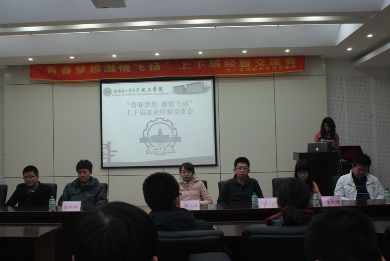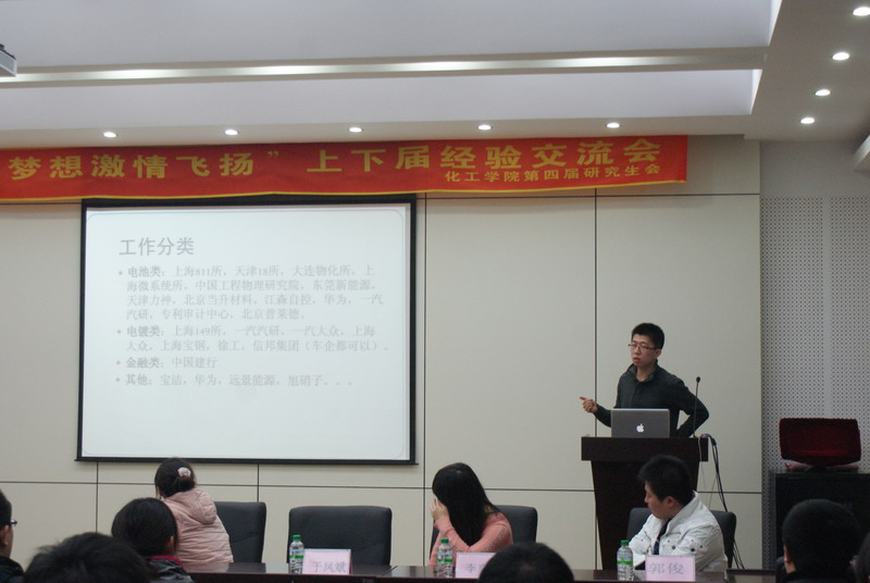 为使化工学院11级硕士研究生了解各自专业详细的就业形势及求职技巧,化工学院研究生会于4月4日18:30在活动中心326举办 “青春梦想,激情飞扬”就业经验交流会。 交流会邀请到已签约工作的应用化学专业的孙笑寒、姜义田、郭俊、于凤斌,化学工艺专业的孟祥斌、刘少柱和高分子专业的李爽娜等7位10级硕士担任嘉宾。 于凤斌同学介绍了10级研究生的总体就业形势和就业方向,详细列举了大家签约的所有单位,分析了各专业的专业特点和竞争优势,并结合自己在江森自控的实习经历深入剖析了他面对职业选择时的心路历程;孟祥斌同学重点介绍了自己在跨行业就业中的经验,以及自己的面试经历;孙笑寒同学结合自己在帕克的实习、成功通过宝洁面试以及最终签约汽研的整个过程,生动形象的分析了国企、私企和外企的特点。建议大家提炼出能证明自己各项能力的小故事,以备面试时急用。互动环节嘉宾们对同学们提出的问题进行了幽默而详细的解答,此次交流会给即将找工作的同学指明了方向,使其更加清楚的了解就业过程中的细节,为11级研究生的就业选择打下了良好的基础。