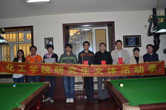 为丰富我院博士生的课余生活,促进研究生全面协调发展,化工学院研究生文体活动季之台球赛于2012年5月5日12:30开始举行。 赛场上,同学们斗志昂扬,激情澎湃,展现了我院学生良好的精神风貌,每一位同学的表现都可圈可点,比赛过程十分精彩。最终,我院博士生王磊、全帅和硕士生刘洋分别获得冠亚季军,为本次比赛画上了圆满的句号。 此次台球赛促进了同学之间的交流,增进了博士与硕士之间的友谊,培养了同学们的团队合作精神,使我院研究生在紧张的学习科研工作之余获得一次难得的方式身心的机会。