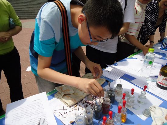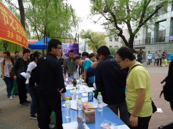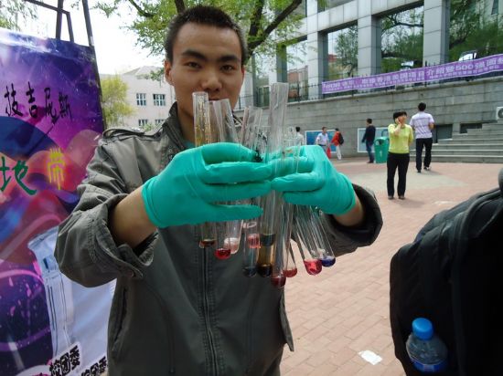 为提高我校学生创新意识,丰富同学课余生活,激发学生对理论应用于实践的兴趣,5月19日上午十点左右,由校团委主办,化工学院团委,化工学院科协承办的第十四届社团文化节之科技吉尼斯色彩地带在哈工大一校区学苑楼门前火热展开。 本次活动采取现场报名制,参赛者根据承办方提供的化学药品自行进行选择并设计实验方案,每位参赛选手可以有最多15分钟的时间考虑配色方案,并以4分钟为限,利用各类化学反应展现颜色变化,使用最少的药品展现出最多的颜色的选手获胜。比赛成绩全部由工作人员记录入册,现场参赛的每位同学们都获赠了纪念礼品。 来自各个学院的参赛同学兴致勃勃的思考着自己的参赛方案,各个化学药品的反应方程式详细的写在纸上,并默记着桌上各种药品的排列顺序,稀盐酸与氧化铜生成蓝色溶液,稀硫酸和铁粉生成浅绿色溶液……四分钟时间,反应完毕的试管不断增多,一种种颜色呈现眼前,化学的神奇不断地展现出来。