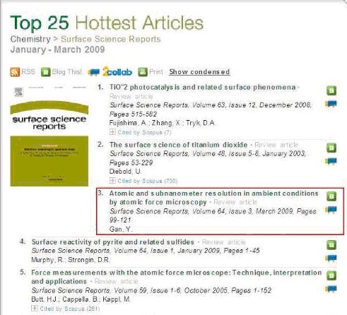 我校化工学院甘阳教授发表在SurfaceScienceReports上的综述在Elsevier出版社2009年第一季度的Top25HottestArticles中列SurfaceScienceReports的第3位,整个物理学科的第15位(请见下图)。我校化工学院甘阳教授发表在Surface Science Reports上的综述在Elsevier出版社2009年第一季度的“Top 25 Hottest Articles”中列Surface Science Reports的第3位,整个物理学科的第15位(请见下图)。 论文图示1