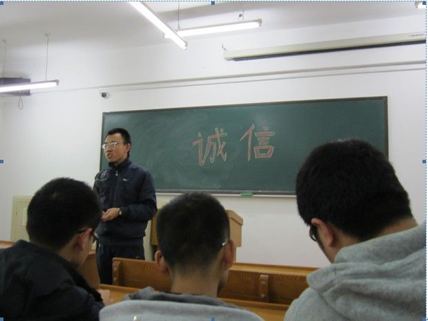 为响应学校喜迎十八大“学习8226;发展”研究生主题活动的号召,积极开展研究生班级立项活动,加强研究生诚信建设,以良好的精神风貌迎接十八大,2012年10月30日中午,化工学院12硕工艺催化班在诚意楼举行“诚信考试”主题班会。班长郝延顺强调了诚信考试的重要性,并希望本班同学再接再厉,在12周的考试中取得好成绩。同时学习委员赵长杰划分了学习小组并安排了具体学习任务和集体自习时间。各位同学就诚信考试问题进行了热烈的讨论。最后全班同学进行了“诚信考试”签名承诺。