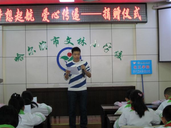 喜迎十八大之际,为充分发挥党员先锋模范作用,引导学生了解社会,回报社会,2012年10月31日下午,化工学院本科生党员随爱之翼志愿服务队前往文林小学开展志愿服务活动。 志愿者徒步来到哈尔滨文林小学,主要开展了爱心捐赠和专题演讲活动。爱心捐赠仪式上,文林小学学生代表发言,表达了对哈工大的感谢和向往;贺金秋老师介绍了哈工大化工学院开展关爱农民工子女志愿服务的总体情况,同时对文林小学的支持表示感谢,并激励孩子们要好好学习,掌握好科学文化知识,将来为祖国为社会做贡献。 志愿者李东琦、任杰、王建飞给孩子们做了专题演讲。内容涉及多姿多彩的大学生活与学习、催人上进的励志故事、奇妙有趣的科学实验,并做了现场演示实验,与孩子们互动,孩子们积极踊跃,与志愿者充分交流。活动在热烈的气氛结束。