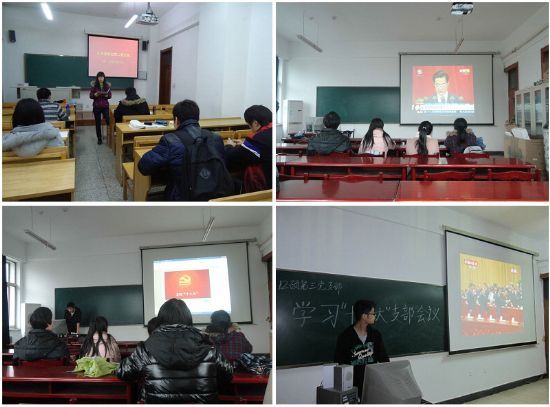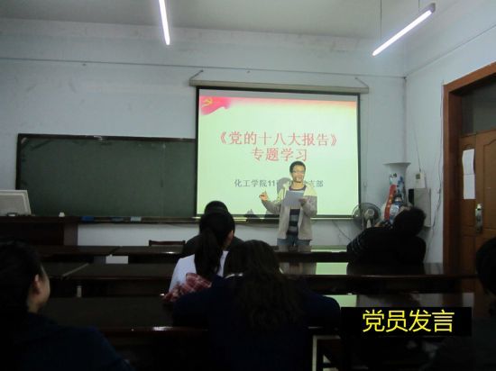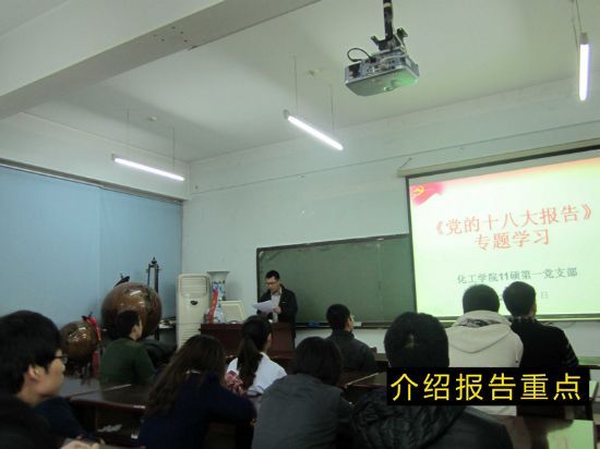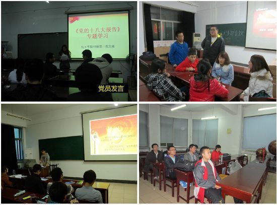 为了庆祝党的十八大胜利召开,更好的学习贯彻十八大精神,2012年11月8日-11月11日期间,化工学院各学生党支部分别召开党支部组织生活会,专题学习十八大报告。 11月9日,09本科生党支部、12硕第一党支部、12硕第三党支部分别开展“学习十八大报告”主题组织生活会,各支部书记向大家讲述了十八大的主要内容,支部成员就大学生创新精神、社会公平等方面进行了讨论。 11月10日,10本科生党支部、11硕第一党支部、12硕第二党支部、博士第二党支部分别开展学习十八大报告活动,支部书记向大家复述了十八大报告的内容要点,支部党员针对政治制度改革、社会分配等问题进行了充分的交流。 11月11日,11本科生党支部、11硕第三党支部开展了主题为“走近十八大”的党支部会议,会议通过观看十八大报告视频,集中学习十八大报告全文,对十八大报告内容进行了深入的学习,支部成员主要对大学生就业和社保等问题进行热烈的探讨。