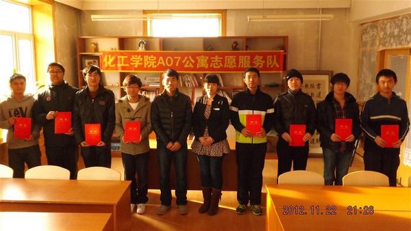 2012年11月22日,化工学院A07公寓志愿服务队正式成立,七公寓楼长李静、化工学院团委负责人贺金秋出席活动。 上午9:00启动仪式在七公寓二楼会议室准时进行。志愿服务队代表周龙鹏介绍了志愿服务队的人员组成情况和日常志愿工作安排。贺老师和李老师分别作了讲话,他们肯定了志愿服务队在公寓日常工作中起到的重要作用,并鼓励志愿者们本着爱护公寓、服务公寓、感恩公寓的宗旨,充分利用课余时间与公寓工作人员一起努力,共同营造和谐美好的公寓文化氛围。 最后,李静楼长和贺金秋老师向志愿服务队发放了聘书。志愿服务队均由党员和积极分子组成,他们将充分发挥先锋模范带头作用,用实际行动,带动同学们积极参与共建公寓,建设丰富向上的寝室文化生活。