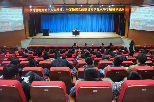 2012年11月29日晚,新活动中心301,应化工学院、理学院、计算机学院、生命学院与技术学院党委邀请,中共哈尔滨市委党校李天明教授为我校党员师生做了 “把握主题,领会实质,深度解读党的十八大精神”为主题的十八大精神专题学习辅导讲座,化工学院党委书记姜兆华、副书记岳会敏、理学院党委副书记杨春雷、生命科学与技术学院党委副书记喻庆勇、四个学院的党员师生、预备党校学员等参加了学习辅导讲座。 李天明教授从战略高度和理论深度出发,联系改革开放和现代化建设的生动实践,对十八大报告进行了系统、透彻、生动的阐释。李教授将十八大报告分成12个部分,重点讲解了“将科学发展观列为党必须长期坚持的指导思想的意义”、 “中国特色社会主义的‘三个自信’”、“中国特色社会主义建设总体布局”和“全面建成小康社会目标”四个方面的内容。李教授深入浅出的阐述使广大师生们迅速把握住了十八大报告的主题和重点,深刻认识到了党的十八大是在我国进入全面建成小康社会决定性阶段召开的一次十分重要的大会,认真学习宣传贯彻落实党的十八大精神,是每名党员当前和今后一个时期首要的政治任务。 讲座结束后,李天明教授与师生进行了热烈的交流和讨论。师生纷纷表示,要深入学习宣传贯彻党的十八大精神,把学习活动与自身实际紧密结合起来,在践行使命中充分发挥党支部的战斗堡垒作用和党员先锋模范作用。 讲座现场 李天明教授做讲座 与会师生细心听讲