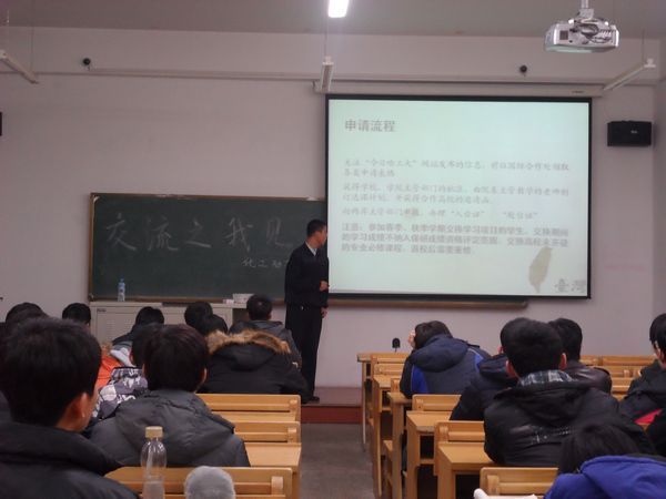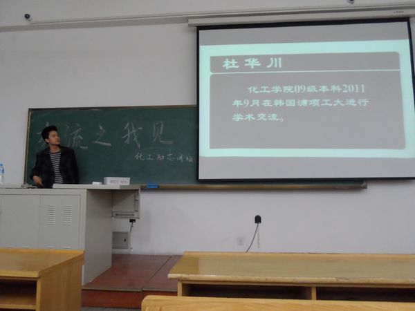 2012年12月14日16:00,由励志化工讲坛组织的韩国、台湾访学交流会在正心106教室成功举办。本次活动邀请到三名分别在韩国、台湾交流学习过的优秀学生代表,为本科生畅谈了自己的经历和体会。 11级硕士生刘磊,展示了在国立清华大学学术交流的环境与文化,并介绍了申请流程。09级本科生海洋,就中国文化大学研习通选类课程及参与的文化交流活动进行介绍,为同学们展现了不一样的台湾文化。09级本科杜华川,通过回顾一年韩国浦项工业大学的交流生活,让同学们了解到韩国教育的特点和独特的异国文化。 提问交流环节中,三位代表耐心为同学们解答了交流方面的问题,并提出了诸多中肯可行的建议,现场气氛热烈。