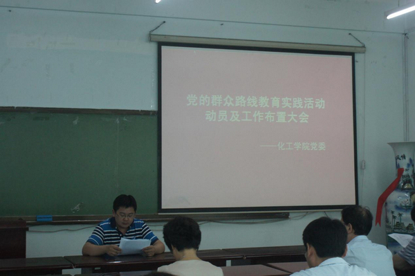 2013年7月15日下午,化工学院党委召开了党的群众路线教育实践活动动员及工作布置会。院党委书记姜兆华、院长黄玉东、副院长孟令辉、党委副书记岳会敏及各党支部书记等参加了会议。 学院党委书记姜兆华传达了校党委书记王树权同志在党的群众路线教育实践活动动员大会上的讲话精神,并要求全院党员干部要加强学习,深刻领会各级领导的讲话精神,坚决把思想和行动统一到习近平总书记的讲话精神上来,统一到学校要求部署上来。他指出,在学习教育、听取意见环节,党员干部认真学习中央和学校关于教育实践活动的一系列重要讲话和文件精神,自学辅导材料,深入群众调查研究;在查摆问题、开展批评环节,要重点围绕为民务实清廉要求,对存在的突出问题进行认真梳理,进行党性分析和自我剖析,开展批评和自我批评;在整改落实、建章立制环节,重点针对作风方面存在的问题,提出解决对策,制定和落实整改方案,对一些群众反映的突出问题进行集中治理;广大党员干部要把教育实践活动与推动学院科学发展、党员干部履职尽责、解决师生员工反映强烈的突出问题紧密结合起来;通过深入开展党的群众路线教育实践活动,凝心聚力,使学院整体工作再上一个新台阶。 党委副书记岳会敏介绍了化工学院党的群众路线教育实践活动方案。 院教育实践活动联络员孟慧传达了学校对基层党委(总支)具体的要求及对教育实践活动的宣传工作注意事项。