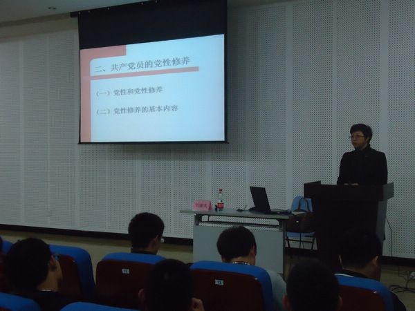 10月23日晚6:30在活动中心227,刘丽美老师为化工学院—理学院—生命学院预备党员培训班带来了精彩第二讲。此次党课培训的主题为“如何度过预备期”。 开课前,刘丽美老师带领着所有学员表演了手语舞《感恩的心》。“作为一名优秀的共产党员,一定要学会感恩!”刘丽美老师寄语学员。 培训课上,刘丽美老师向学员们介绍了党章的学习;党性修养;预备党员转正;身心素质的提高等四个方面的内容。在党章学习上,刘丽美老师为学员们耐心讲解了党的性质,党的指导思想,党的最终目标和现阶段的任务,党在社会主义初级阶段的基本路线,以改革创新精神全面推进党的建设等内容。听着刘丽美老师的话语,学员们都若有所思地点着头。“党性修养是指党员的自我教育、自我改造和自我完善。党性修养包括:政治理论修养、思想意识修养、道德品质修养、组织纪律修养、作风修养、文化科学知识修养。”学员们认真聆听着讲解。 在刘丽美老师的引导下,学员们深入了解了预备党员转正的相关程序。“从党组织向党内外宣布吸收新党员的决定,到转为中共正式党员并将入党转正材料及时装入本人档案。严肃庄重的入党程序,让我更加清楚地认识到共产党员必须保持先进性!”一位学员这样说道。 最后,刘丽美老师从端正入党动机、做到思想入党;注重政治理论的学习;努力成为科学发展观的实践者;注重言行,做到“慎独”;刻苦学习、勤奋工作、不断创造、自觉奉献;注重培养良好的身心素质;注重作为青年领导素质和能力的培养等六个方面激励学员们努力提高自身素养,争取如期成为一名合格的中共党员,并为党的事业奋斗终生!