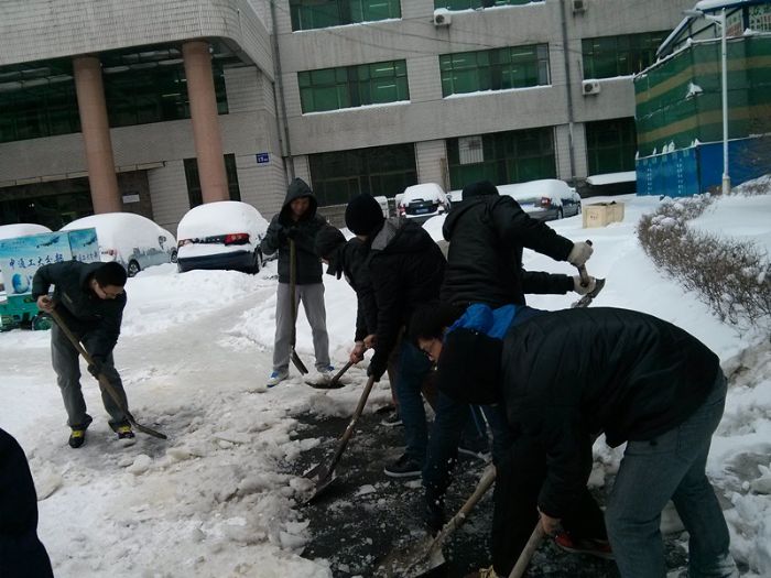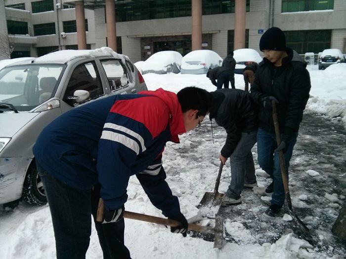 2013年11月19日,1114211和1114212两个班级的全体同学在辅导员李佳杰的带领下于理学楼前进行了清冰除雪志愿者活动。 从2013年11月17日开始,哈尔滨地区普降大雪,至11月19日清晨,积雪达20厘米,厚厚的白雪覆盖了学校校园,给师生出行带来诸多不便,扫雪任务异常艰巨。然而,寒风和大雪丝毫没有影响同学们的热情和工作效率,大家发扬了吃苦耐劳、顽强拼搏的战斗精神,团结协作,顶着寒风,将分担区的积雪清扫干净。经过一个多小时的奋战,此次扫雪任务圆满完成,理学楼靠近管理学院的道路上积雪被清理干净。 虽然室外气温依然很低,但是同学们劳动的热情,团结的力量让这个冬日变得格外灿烂和温暖,为师生们的出行提供了便利。