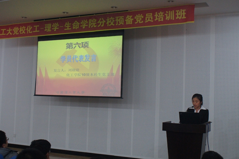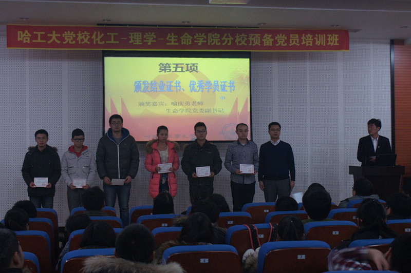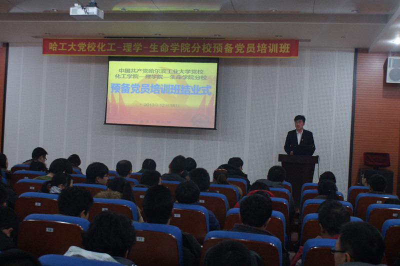 2013年12月18日,化工学院—理学院—生命学院预备党员培训班结业式在活动中心227顺利举行。理学院党委副书记杨春雷、化工学院党委副书记岳会敏、生命学院党委副书记喻庆勇和全体培训学员参加了结业式。 结业式在庄严的《中华人民共和国国歌》和《哈工大党校校歌》中拉开帷幕。随后通过视频形式,一起回顾了党校学习历程。本次预备党员党校培训班共组织专题讲座五次,特邀专家讲座一次。董嵩斌老师慷慨激昂,陈立媛老师高屋建瓴,刘丽美老师娓娓道来,冯智勇老师深入浅出,李敬伟老师意味深长,高献忠老师诙谐幽默,老师们的授课让学员在感受快乐的同时,也收获了系统的知识。每次讲座后组织了学员讲坛活动,给大家提供了展现自己的机会。课后以小组为单位组织主题实践调研活动和志愿服务活动。课后的社会实践、志愿服务等活动,很大程度提高了我们理性分析问题和解决问题的能力,这将有助于我们在今后的工作中,以科学的思维方法和全局观念去化解问题。 杨春雷老师宣读了党校学员结业决定和表彰决定,喻庆勇老师为学员代表颁发证书。学员代表刘迎迎发言表示,通过将近两个月的党校学习,全体学员在思想上和行动上已取得了很大的进步,并表示在今后的学习和工作中,进一步提高自己的理论水平和政治素质,不断加强党性修养。岳老师首先对通过培训班考核的学员表示祝贺,并对大家提出了要求:希望大家进一步端正入党动机,不断深化对党创新理论的学习,不断增强责任心和使命感,处处体现党员的先锋模范作用。 结业式伴随着庄严的《国际歌》中落下帷幕。