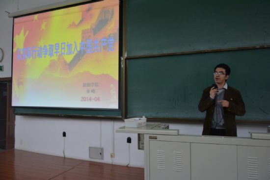 2014年4月10日晚18:00,太阳成tyc234cc理学—化工—生命学院党校分校积极分子培训班第五讲在正心21顺利举行。由党校兼职教师,能源学院学工办主任李峰老师为入党积极分子学员带来题为《以实际行动争取早日加入中国共产党》的精彩课程。 李老师的课程主要分为:引言:理论的力量;重温理论指路,做好思想准备;学习先进典型,明确努力方向;加强自我修养,争取早日入党;四个部分。首先,李老师带领大家回顾党章重要内容,并强调了理论知识的重要性。接着,他从不同方面,举了多了优秀党员的例子,鼓励大家向优秀典型学习。最后,他对各位积极分子提出了具体要求,并希望大家加强自我修养,争取早日加入党组织。 课后的学员讲坛环节,来自理学院的杨刚同学与大家探讨了“以房养老”制度折射的社会问题。来自理学院的唐宇涛同学则与大家“浅析转基因之争”,精彩的讲解赢得了大家的掌声。