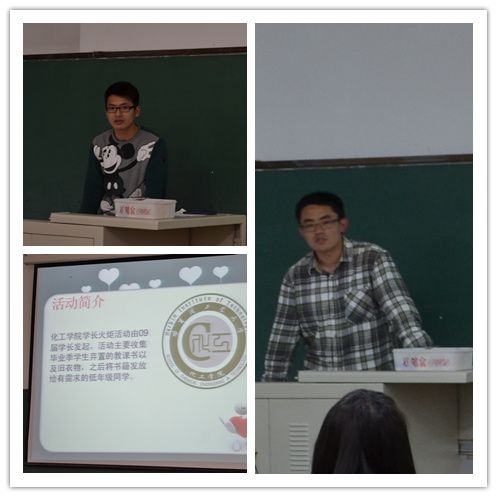 5月19日晚,化工学院第二届“学长火炬”动员大会在正心109教室成功开展。化工学院志愿者协会负责人、10级本科生及团委书记李佳杰参加了大会。 志愿者协会的同学详细介绍了“学长火炬”的内容,意义以及开展的具体过程,使得与会的大四学长学姐们都得以充分认识这个化工学院的品牌活动,为“学长火炬”活动的后续开展,做了一次有效的铺垫。化工学院“学长火炬”活动由13届毕业生发起,活动主要形式为收集毕业季学生弃置的教课书以及旧衣物,之后将书籍发放给有需求的低年级同学。据不完全统计,第一届学长火炬行动总共收到教科书450本,考研辅导书籍260本,课外书以及杂志130本,另外衣物50余件,一次性满足了学院大二学生大部分的课本需求,还有大三学生考研资料的需求。该活动旨在实现资源的可循环利用和爱心的传递,让更多学院的学弟学妹们获得来自学长学姐们的关怀和资助。 希望此次的“学长火炬”活动可以成功开展,并在以后历届化工学子当中得到不断的传承和发扬,为化工学院的发展做出一份独特的贡献。