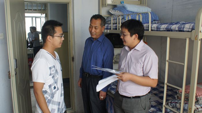 化工学院领导于9月3日下午走进2014级新生宿舍,化工学院党委书记姜兆华、党委副书记岳会敏、辅导员李佳杰走访寝室,与大一新生和家长进行交流。 走访过程中,姜兆华书记向学生和家长们介绍学校和学院情况,他还关心同学们的日常生活,对冬天寝室干燥、户外活动保暖和及时添加冬衣等问题向同学们进行了提醒。姜兆华书记希望同学们可以尽快适应大学生活,重视初期学习,养成良好的学习习惯,为成长成才奠定坚实基础。岳会敏副书记向学生和家长就读研深造、就业工作等相关问题做了解答,向同学们介绍了学院在贫困同学资助等方面的政策,鼓励同学们提高自身综合素质,在实践锻炼中成长为一名优秀的化工人。 整个走访过程中,院领导为新生和家长答疑解惑,加深了他们对学院的了解,也使其感受到了来自学校的关怀。